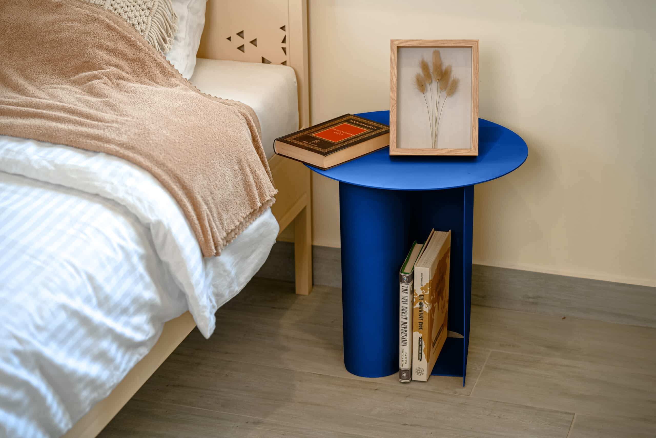 Dieser Tisch wurde mit zwei integrierten Bücherfächern entworfen und hilft Ihnen, Ordnung zu halten, während Sie Ihre Lieblingslektüre, E-Reader oder täglichen Accessoires in Reichweite und ordentlich verstaut aufbewahren. Das helle, digital inspirierte blaue Finish ist perfekt für alle, die Originalität schätzen und ihrem Zuhause eine frische, ausdrucksstarke Energie verleihen möchten.