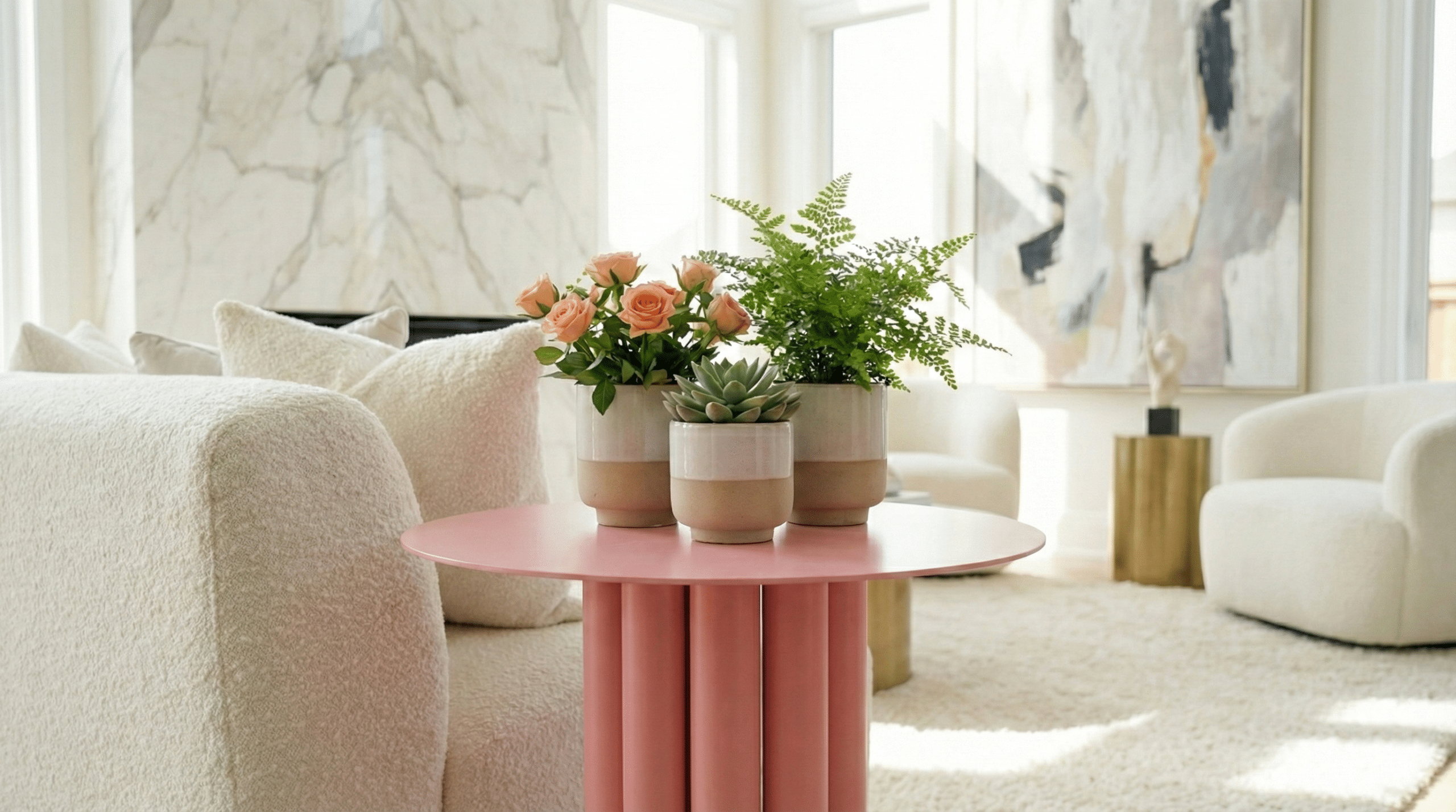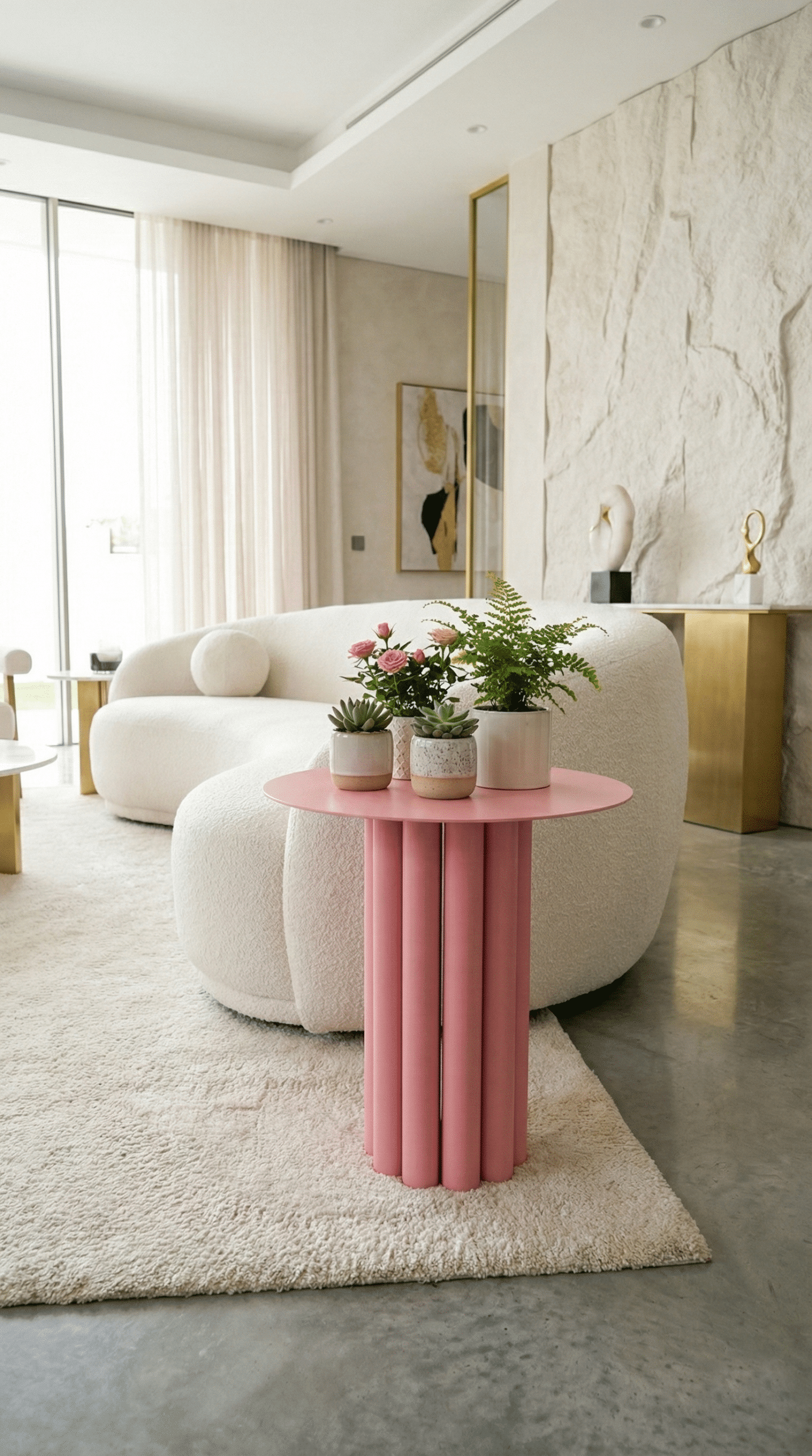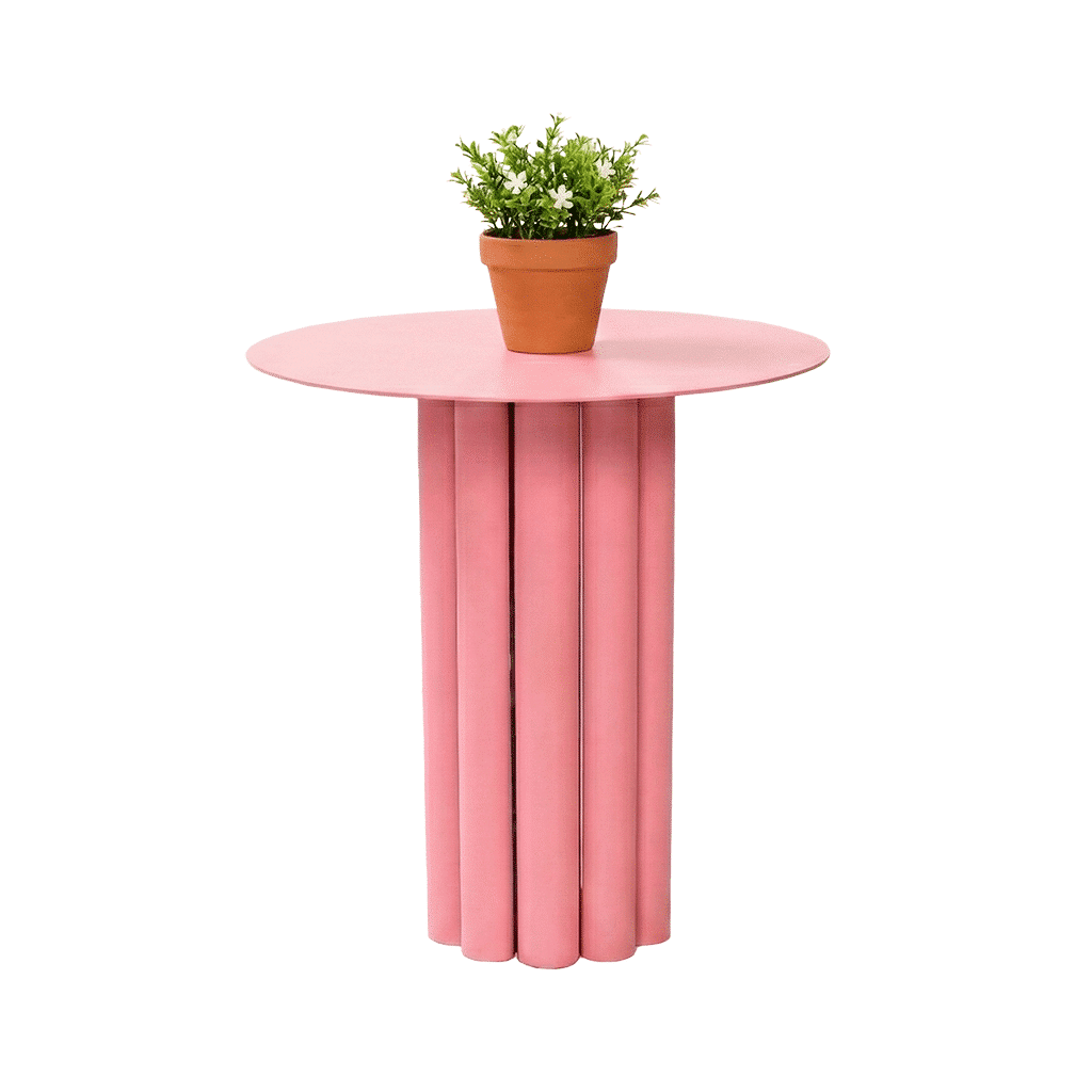 Sanfter Charme – Der Aurea Metall-Couchtisch in Light Pink.