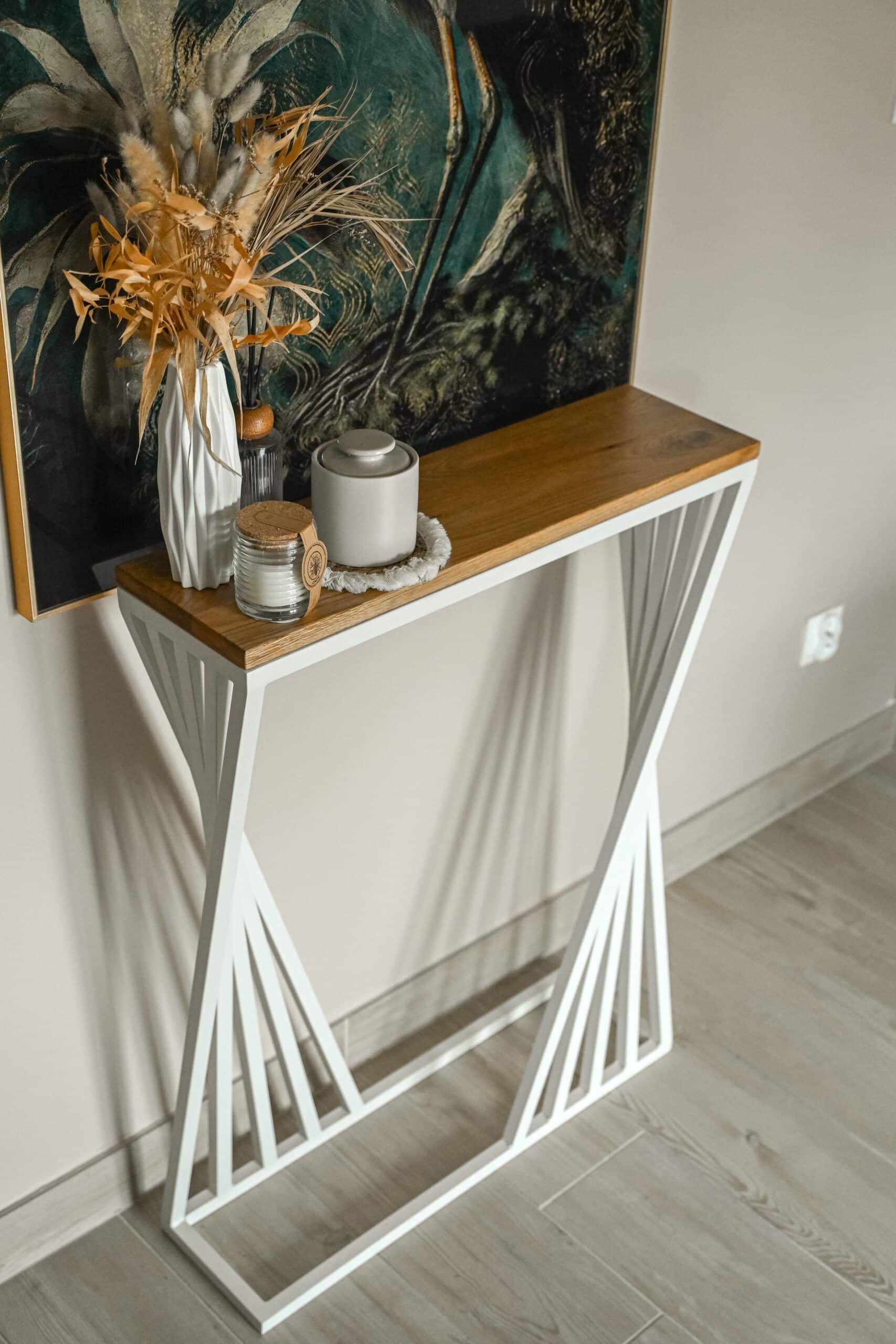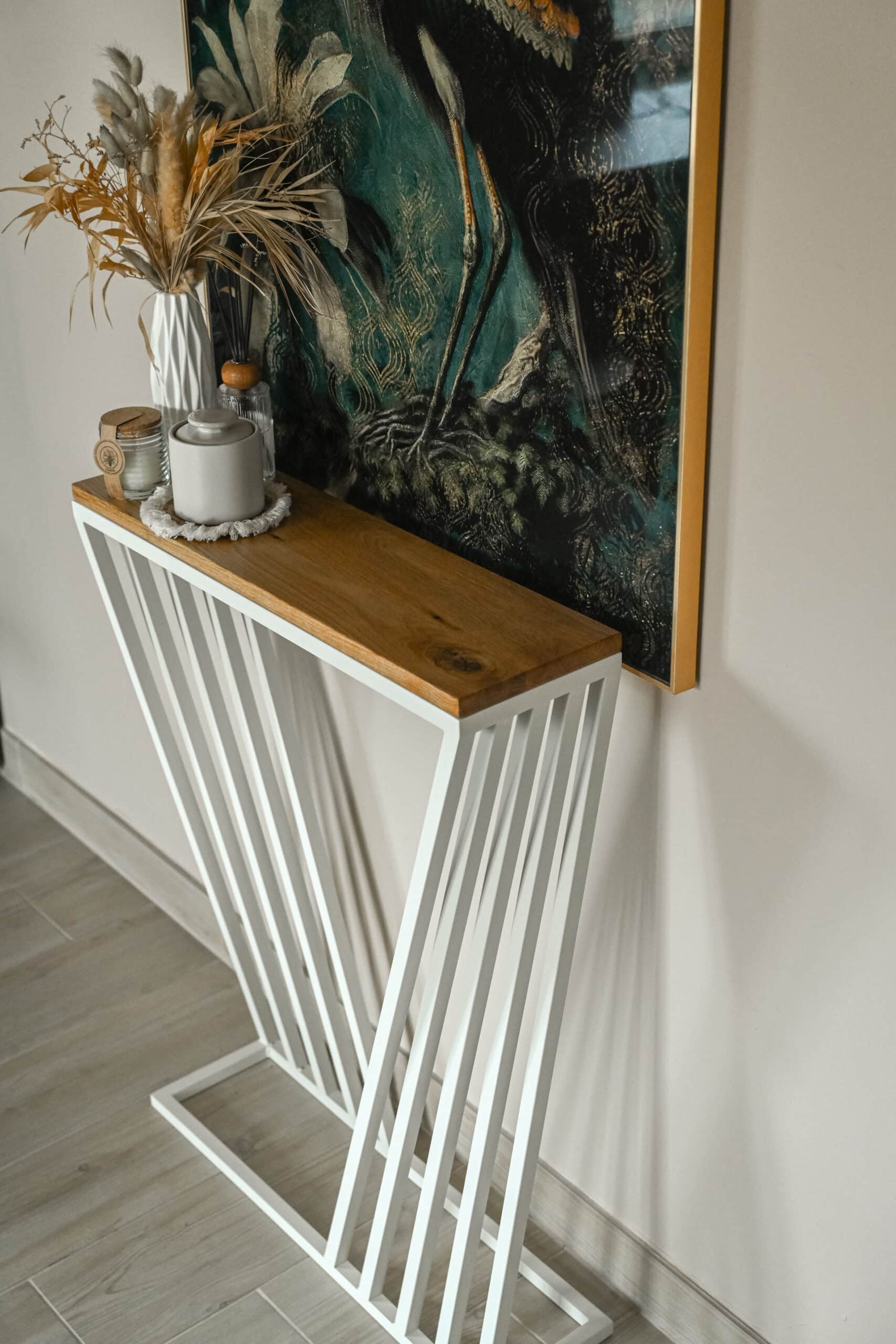Die Verta Konsole mit Eichenplatte ist äußerst funktional und passt sich verschiedenen Räumen im Haus an. Im Schlafzimmer kann sie als Schminktisch oder zusätzliche Ablagefläche für kleine Utensilien dienen. Im Esszimmer bietet sie einen eleganten Platz zum Servieren von Speisen oder zum Ausstellen von Tischdekorationen bei Zusammenkünften. Die massive Eichenoberfläche gewährleistet Haltbarkeit und Widerstandsfähigkeit im täglichen Gebrauch, während die grauweiße Basis Leichtigkeit und ein modernes Gefühl verleiht. Es ist eine perfekte Verbindung von klassischer Form und moderner Nuance, die Ihrem Interieur einen einzigartigen und polierten Charakter verleiht.